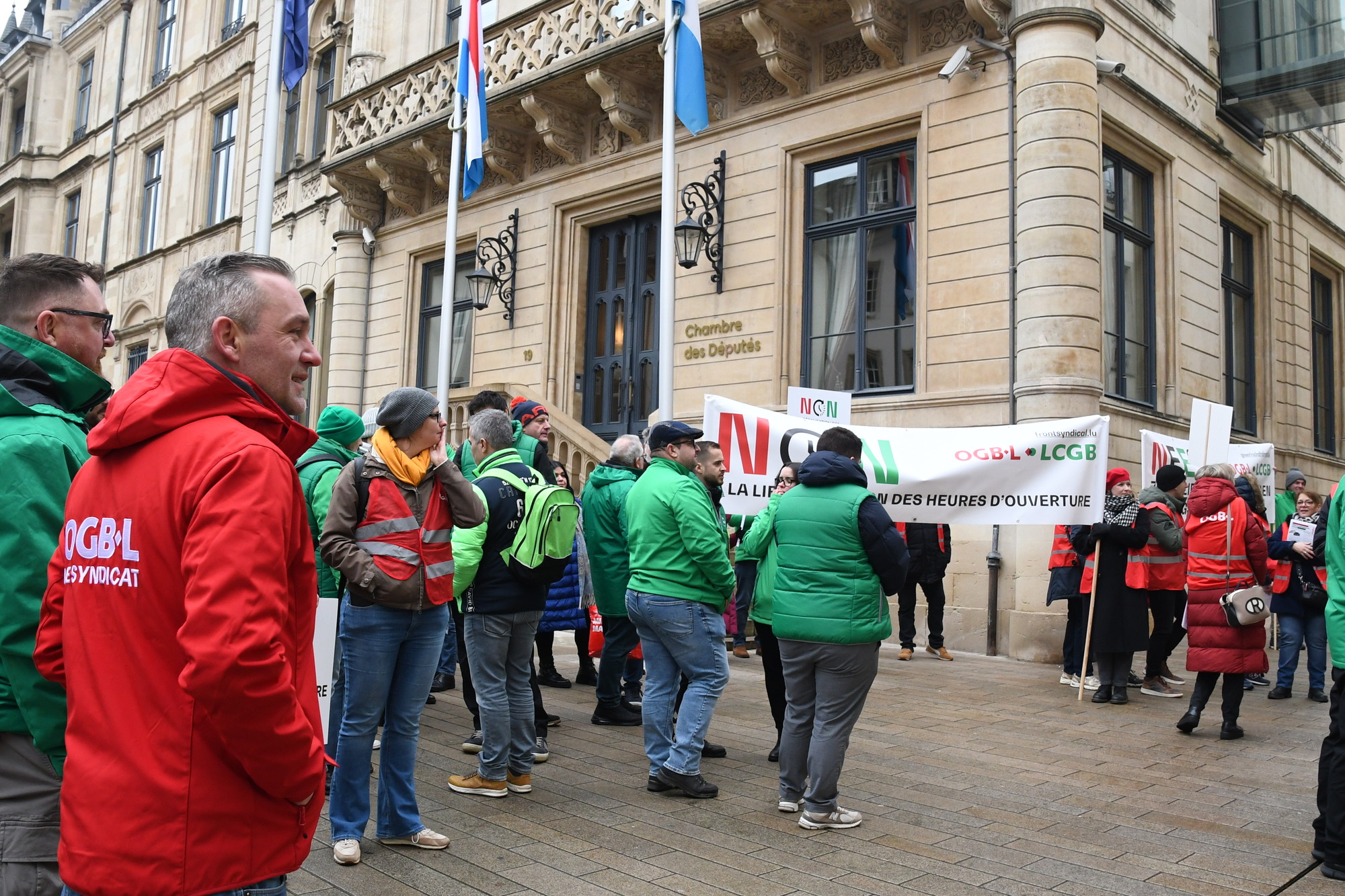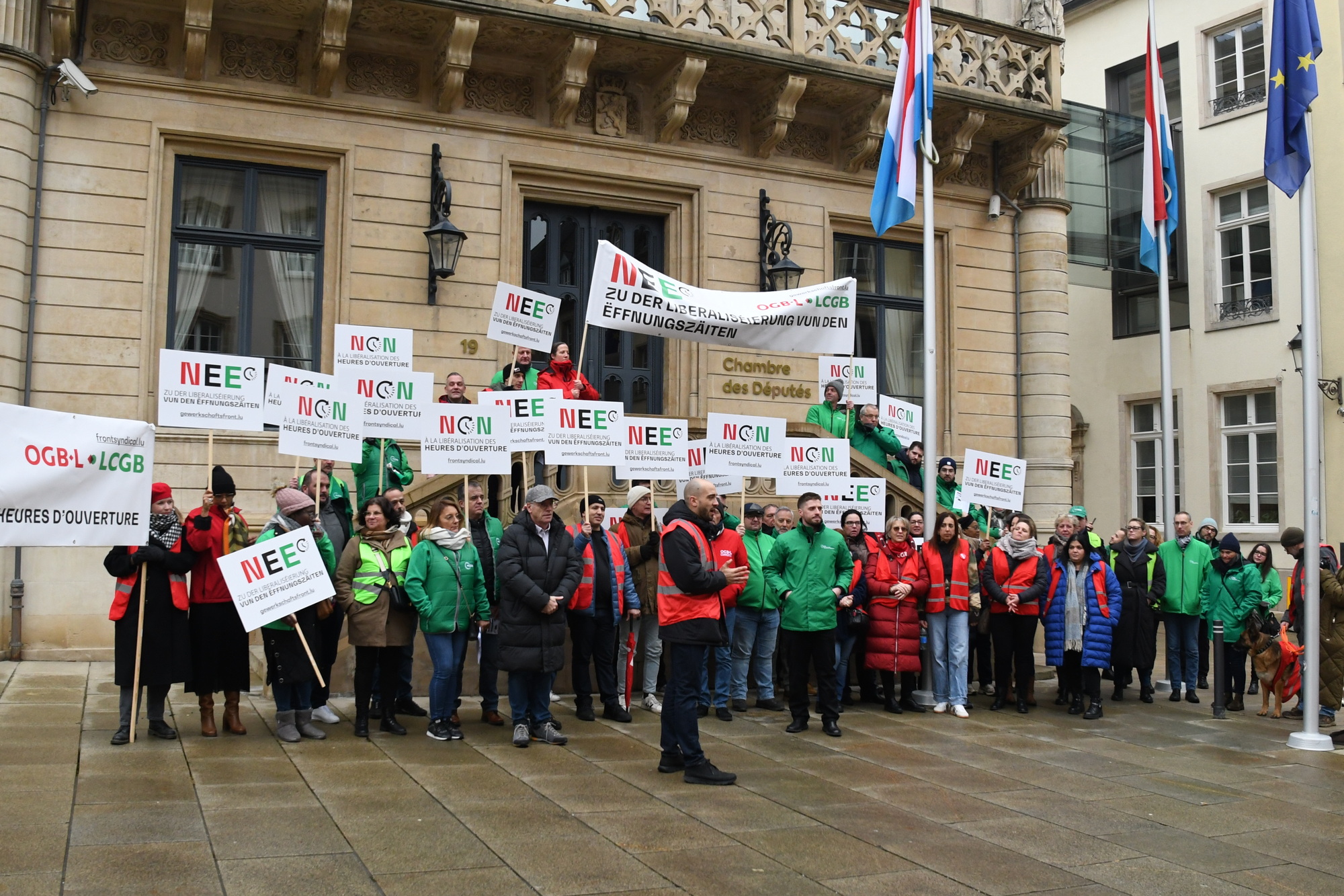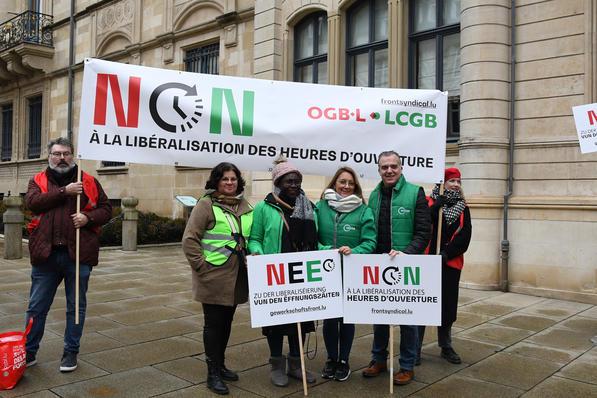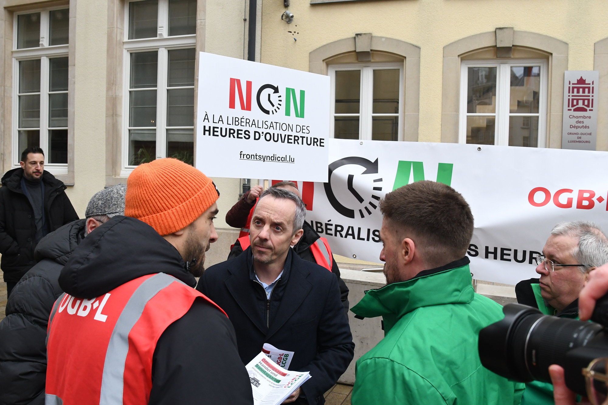 Heute fand vor der Abgeordnetenkammer eine Sensibilisierungsaktion über die geplante totale Liberalisierung der Öffnungszeiten im Handel statt. Insbesondere sollten die Mitglieder der Arbeitskommission auf die Forderungen der Gewerkschaften aufmerksam gemacht werden.