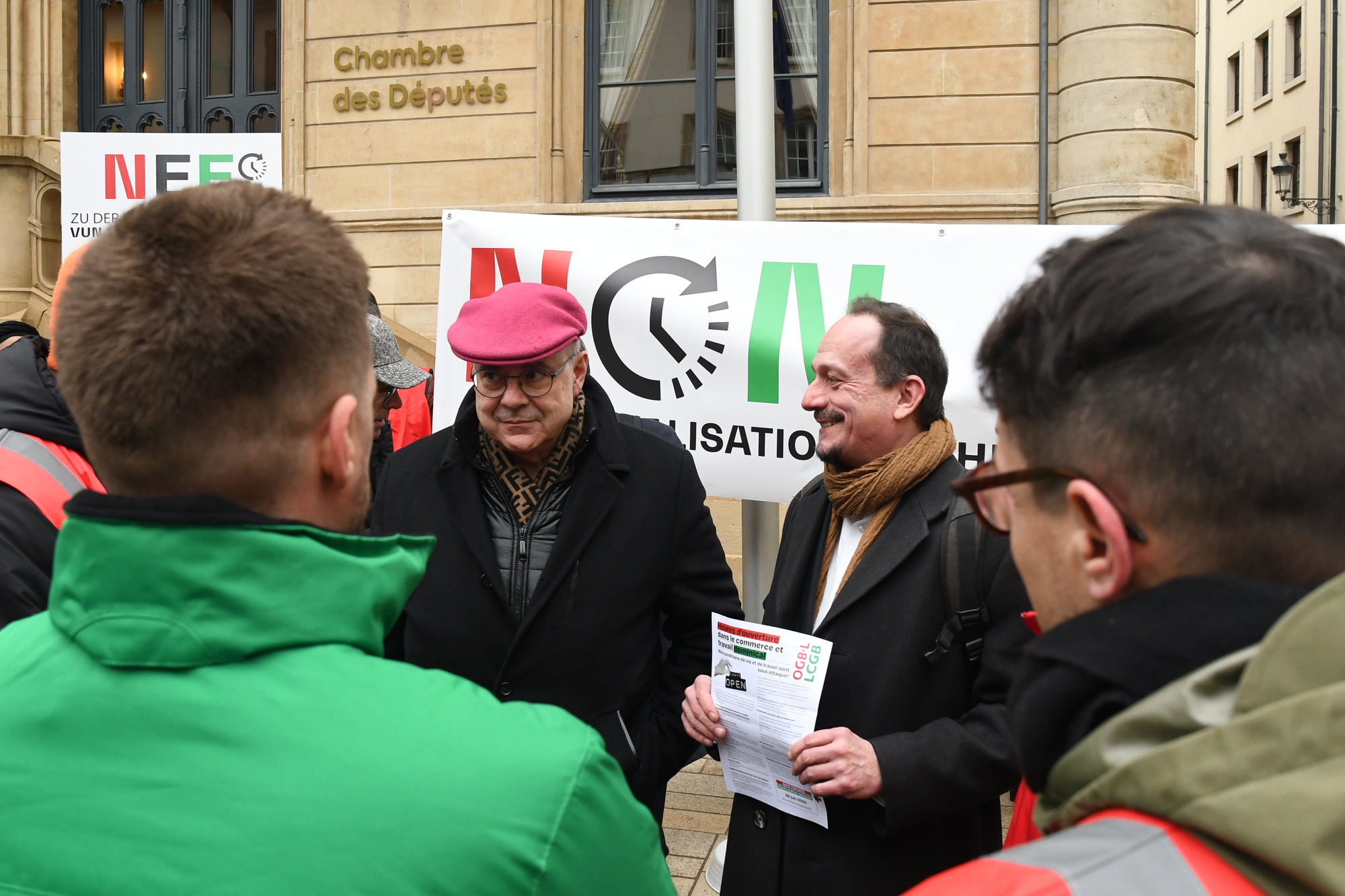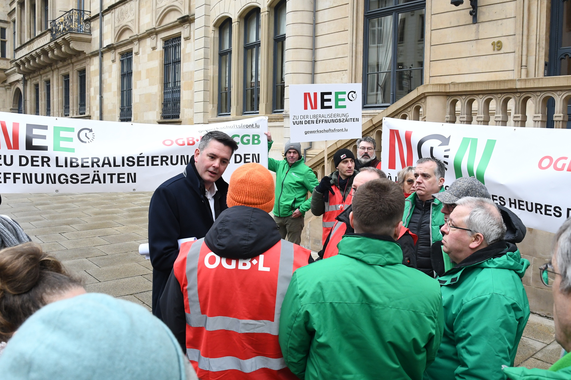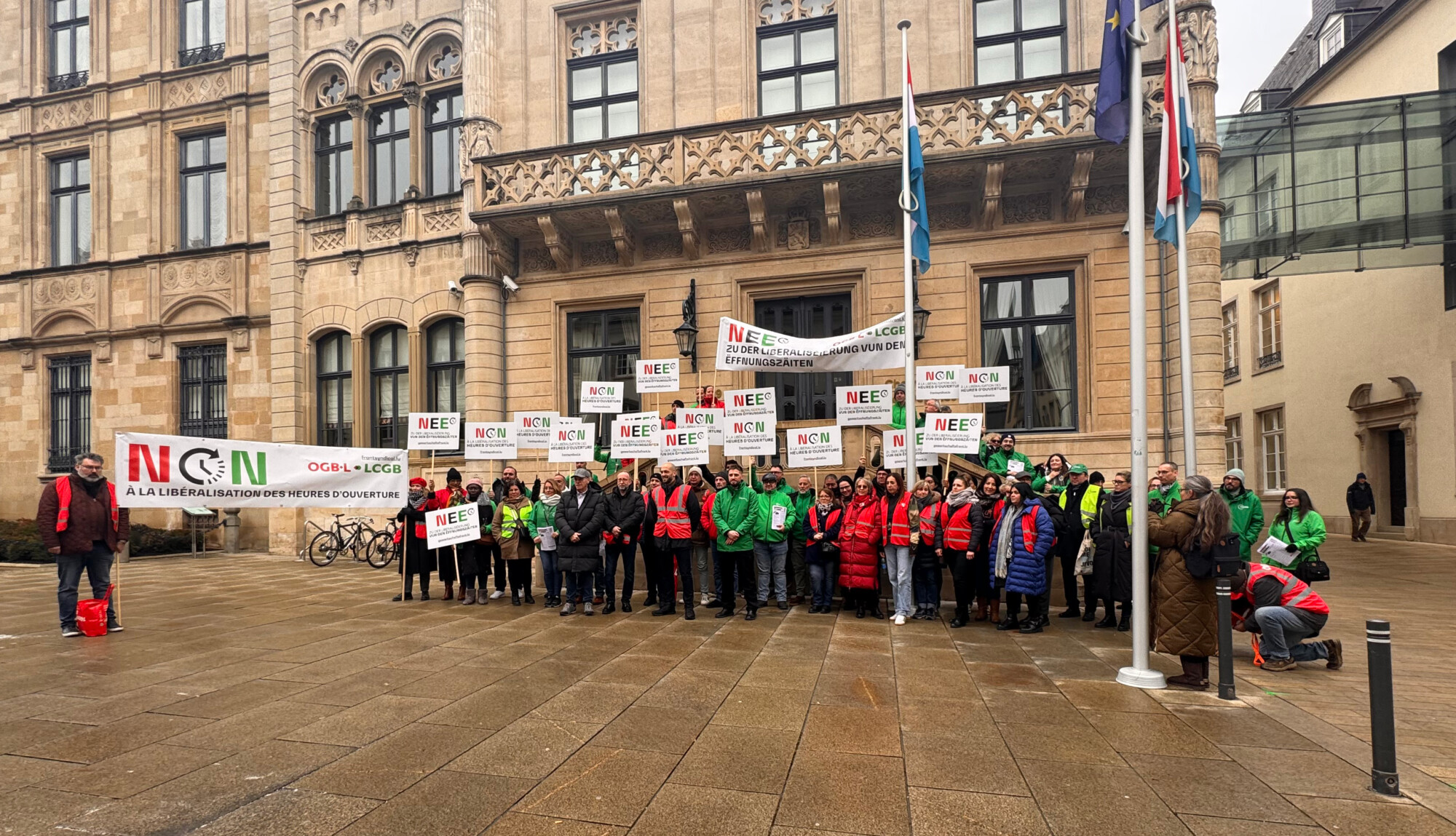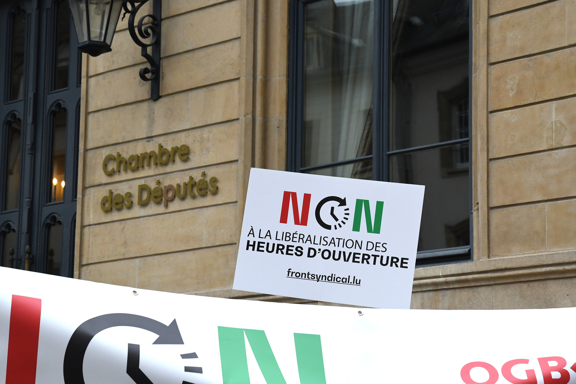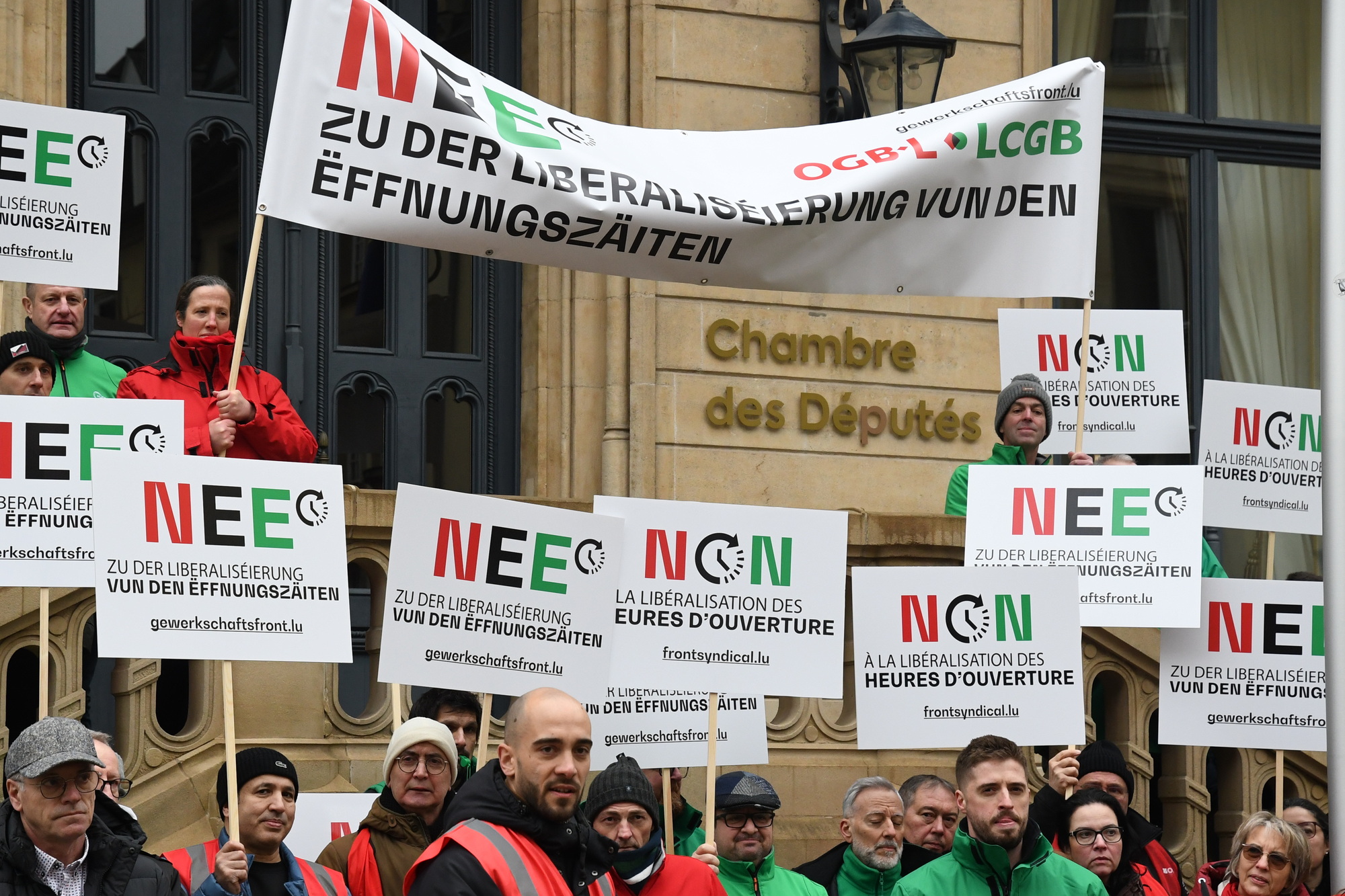 Heute fand vor der Abgeordnetenkammer eine Sensibilisierungsaktion über die geplante totale Liberalisierung der Öffnungszeiten im Handel statt. Insbesondere sollten die Mitglieder der Arbeitskommission auf die Forderungen der Gewerkschaften aufmerksam gemacht werden.