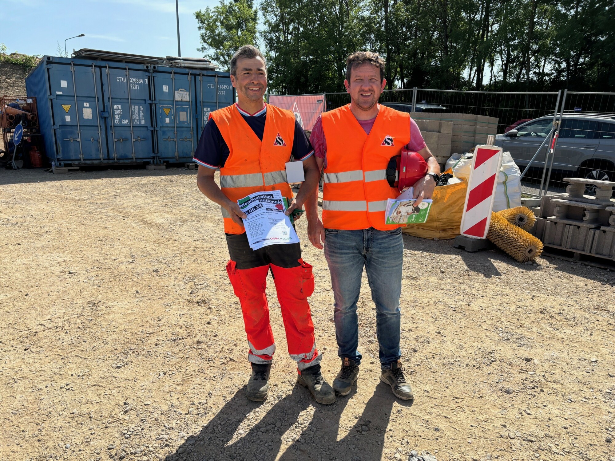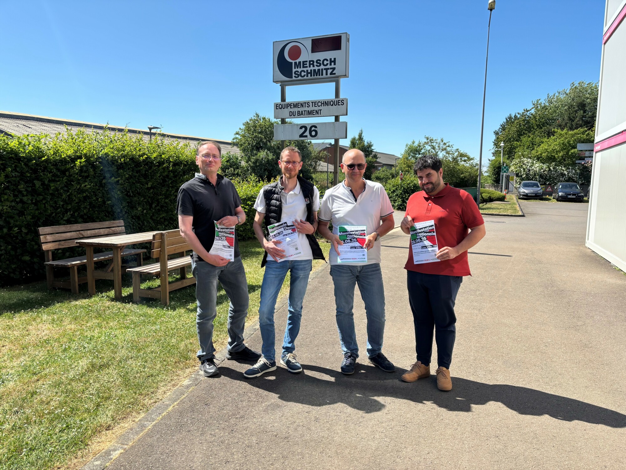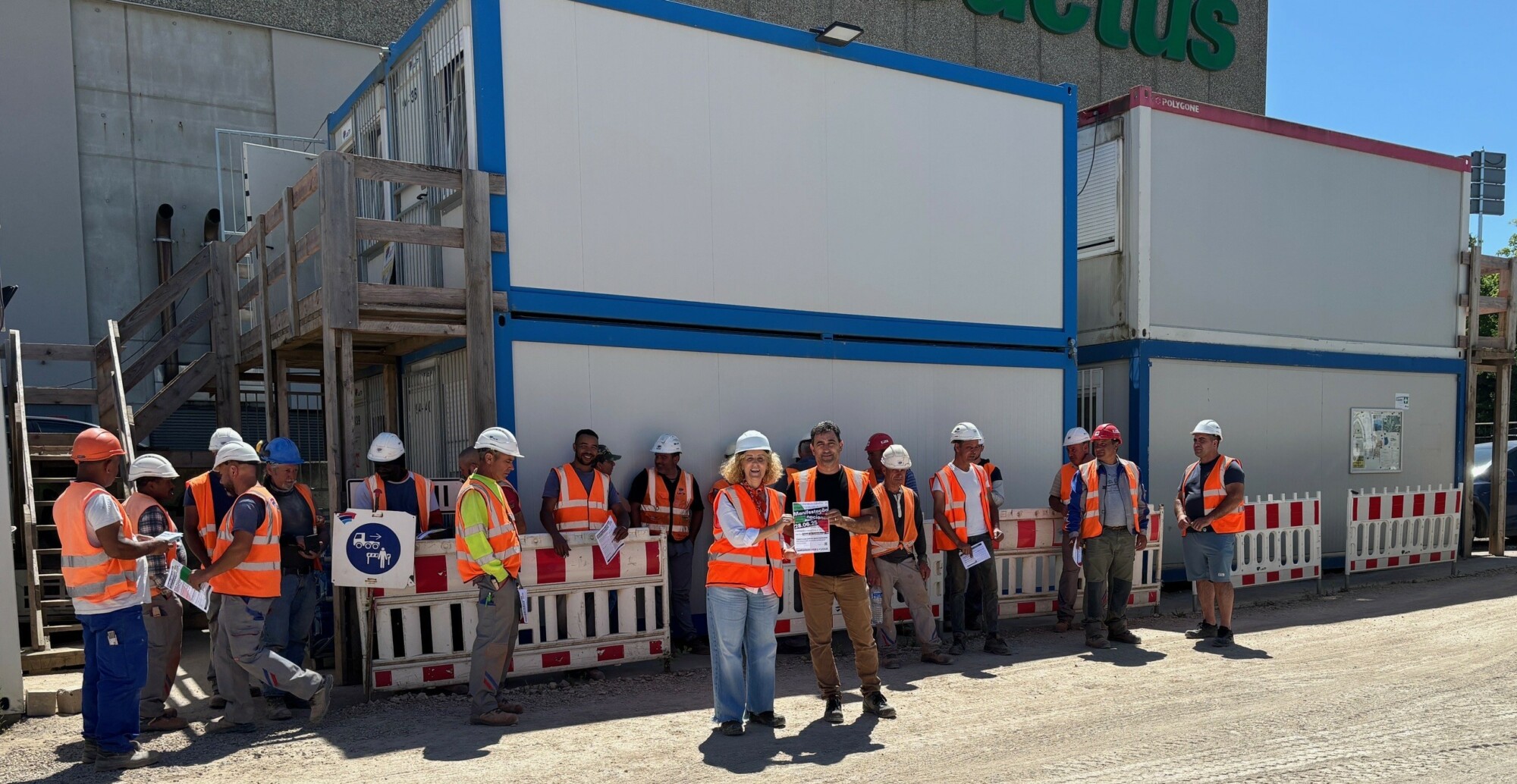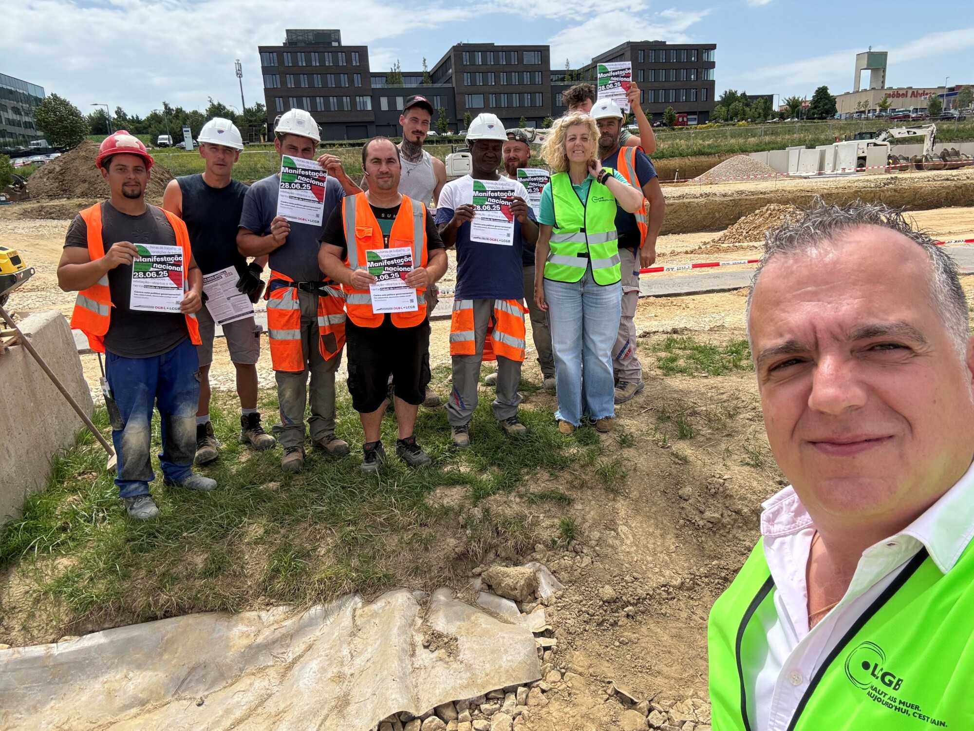 Bei einer Verteilaktion wurden die Beschäftigten der Bauunternehmen Mersch & Schmitz, Sopinor Constructions und LUX T.P. für die große nationale Demonstration am 28. Juni in Luxemburg-Stadt mobilisiert. Die Beschäftigten zeigten ihre Solidarität im Kampf für unser Sozialmodell, das auf Kollektivverhandlungen und Kompromisskultur im Interesse des Landes beruht, für unsere Löhne und Arbeitsbedingungen, für ein solidarisches und allgemeines Sozialversicherungs- und Rentensystem.