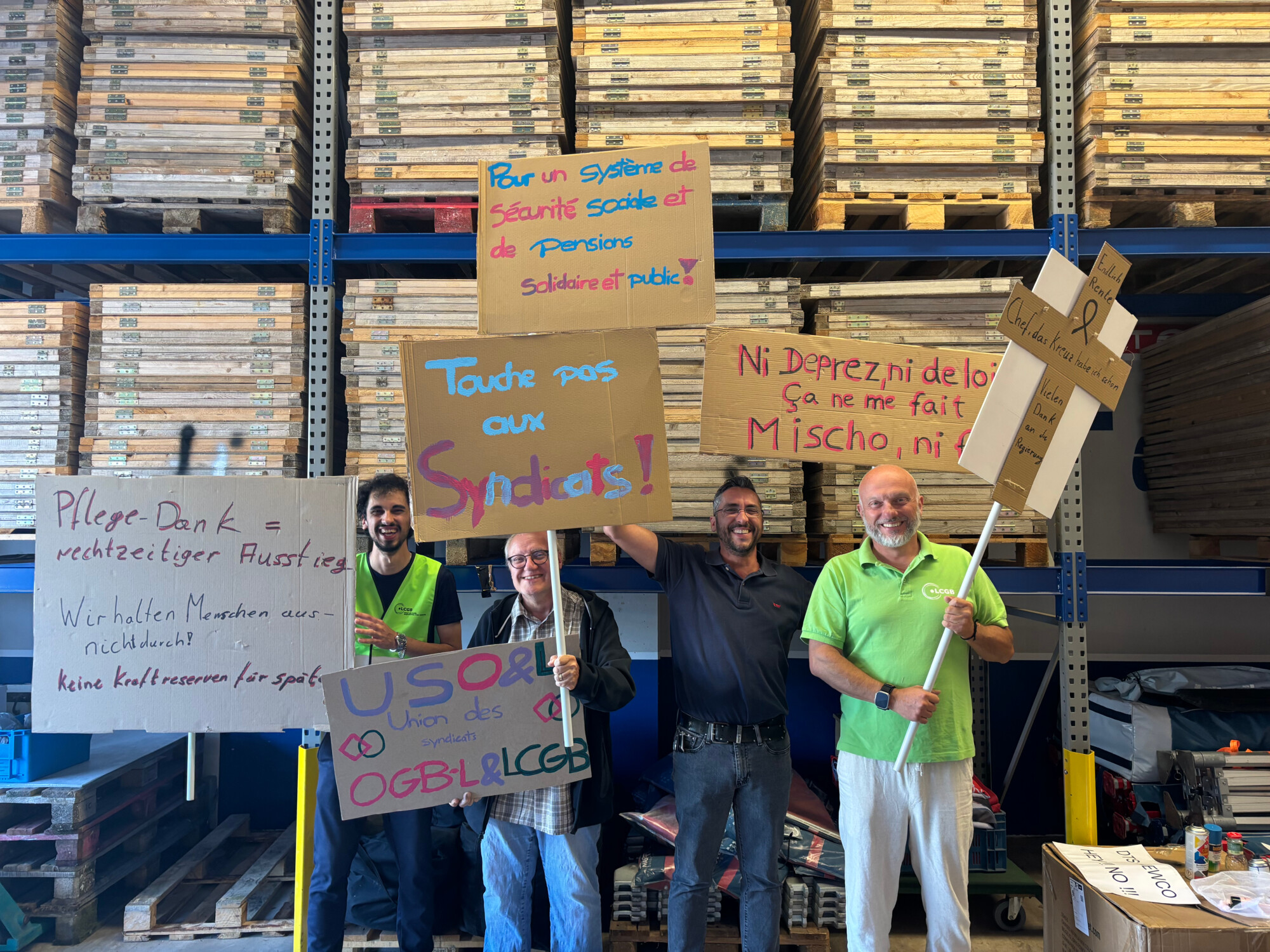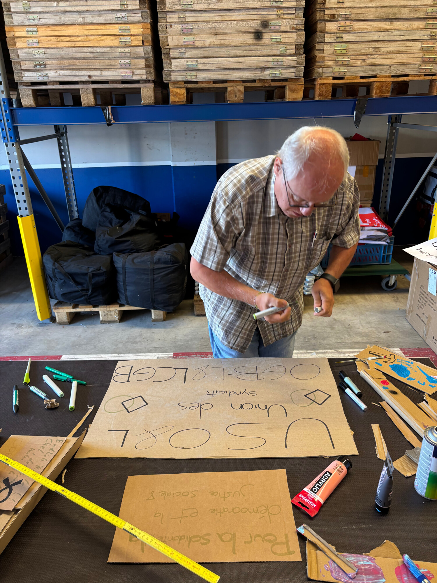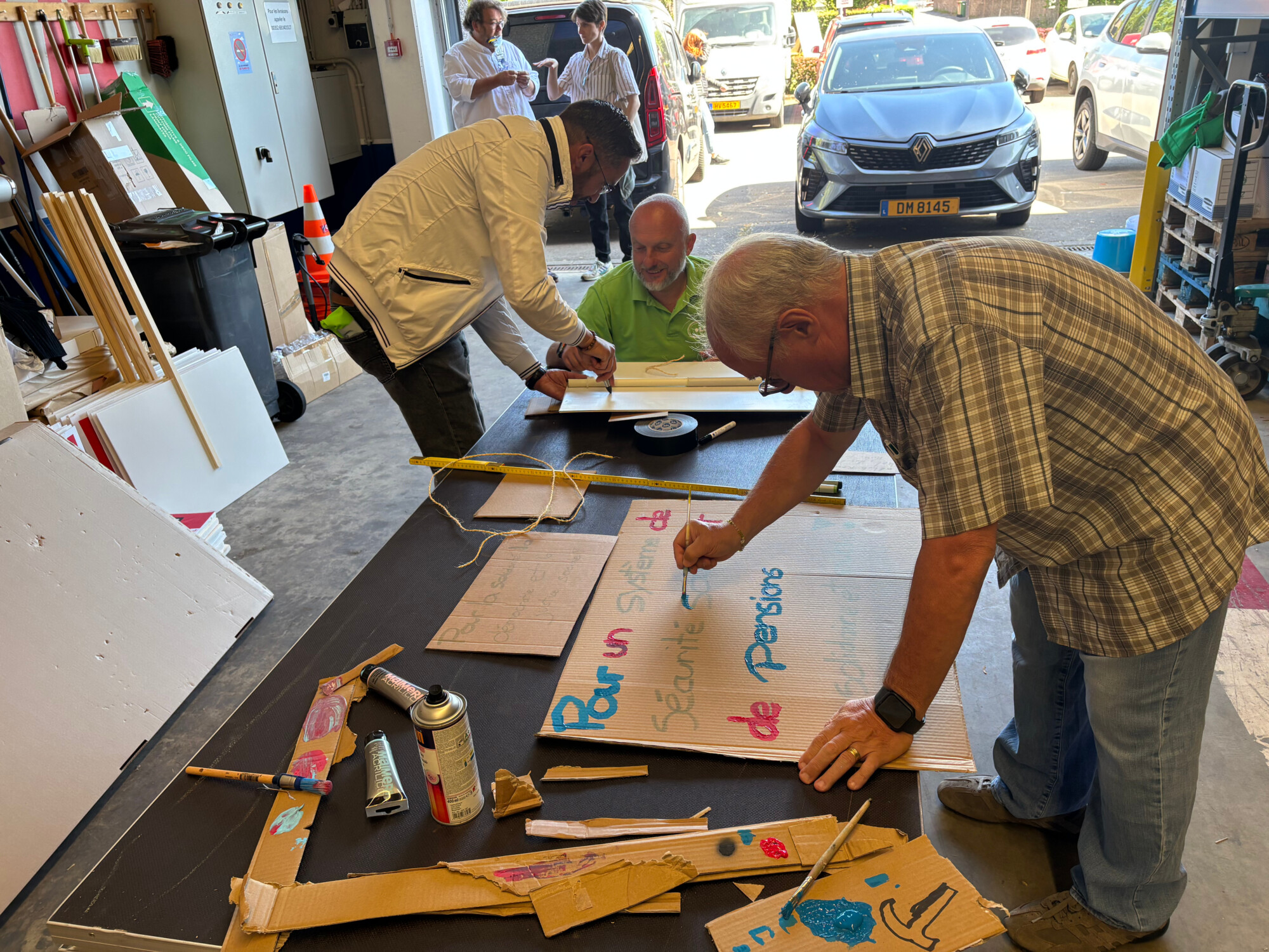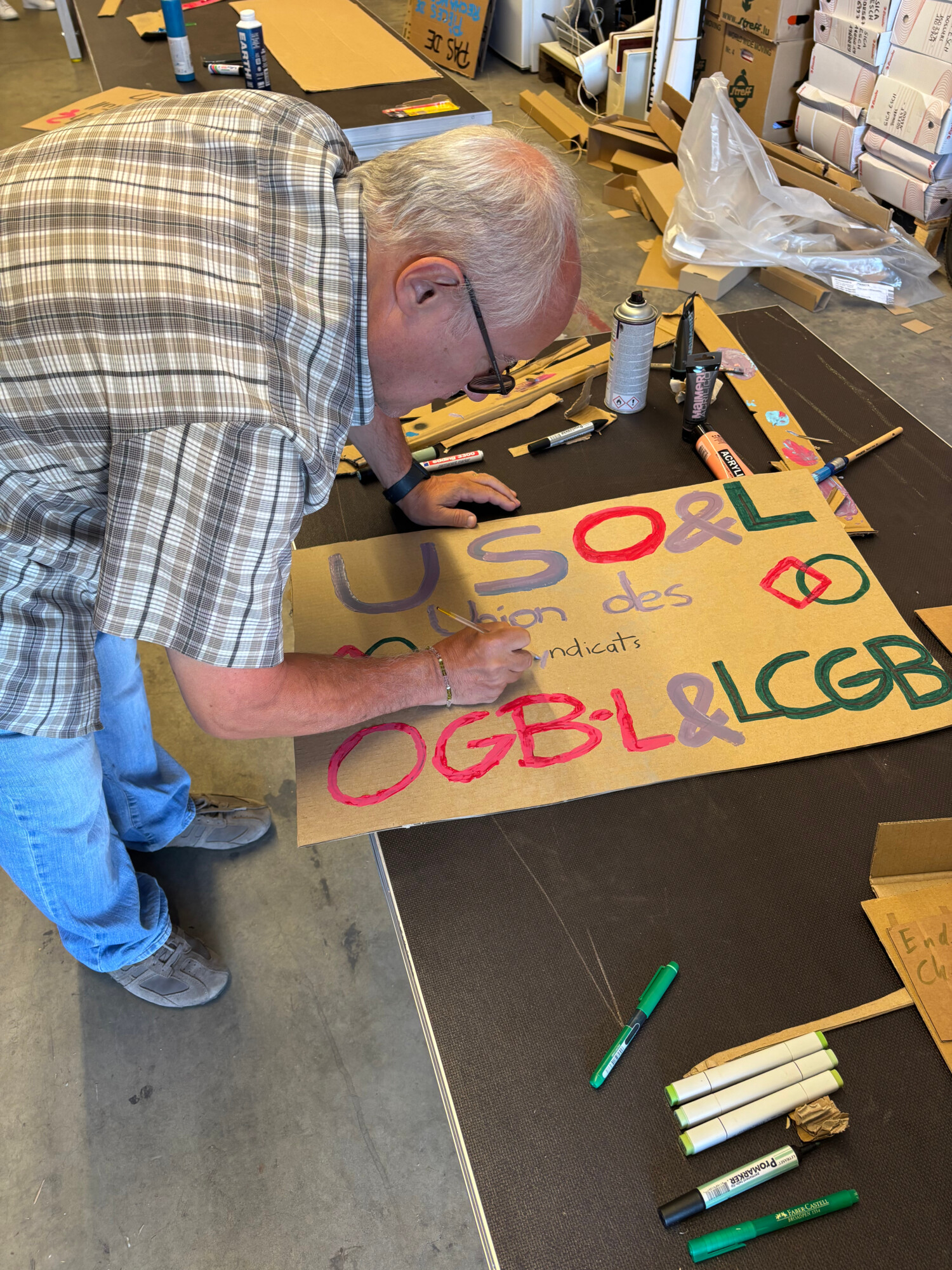 Die Mitglieder des LCGB und des OGBL aus dem Gesundheitssektor haben sich in einer gemütlichen Atmosphäre getroffen, um die Plakate für die große Demonstration am 28. Juni vorzubereiten.