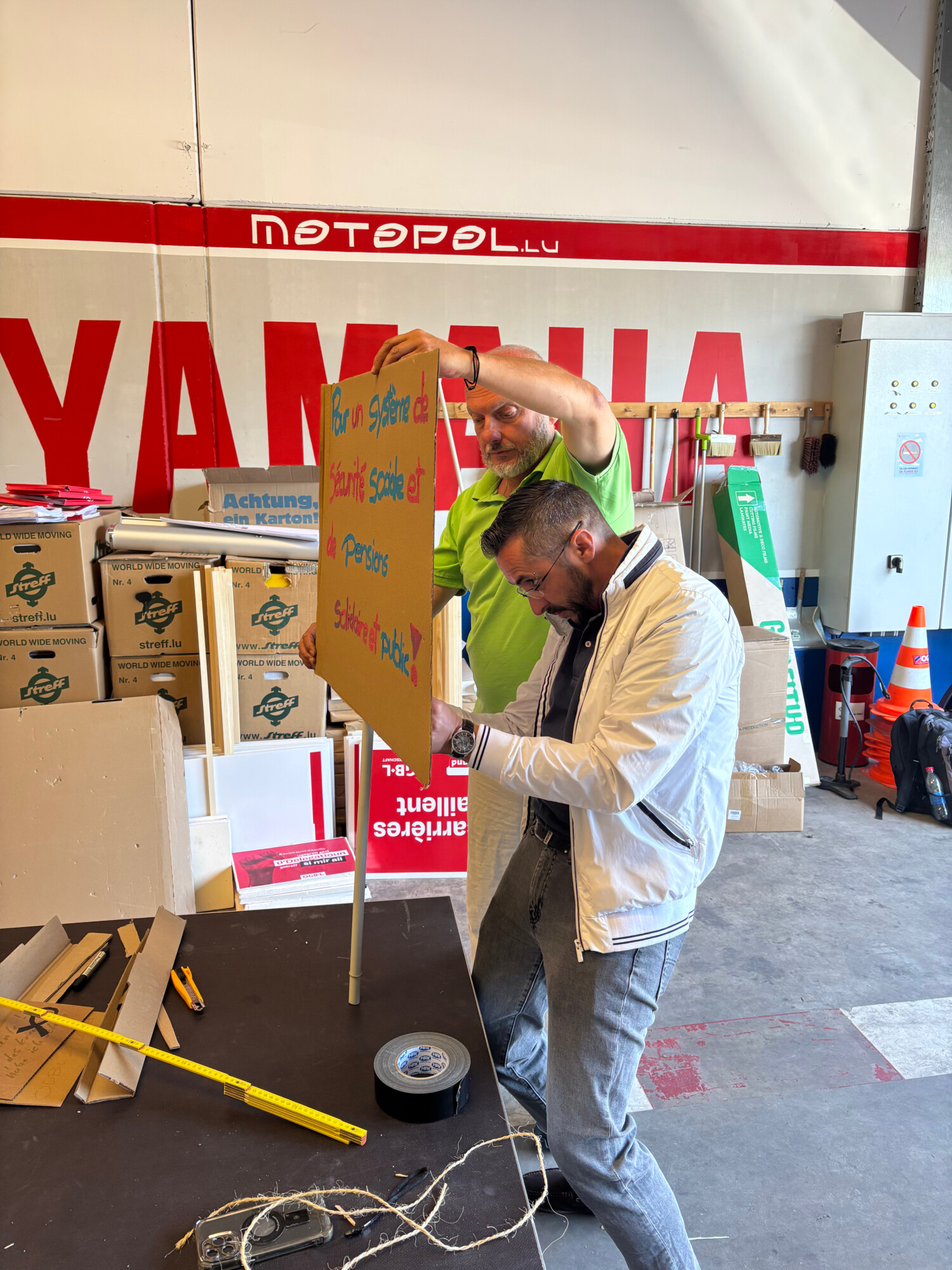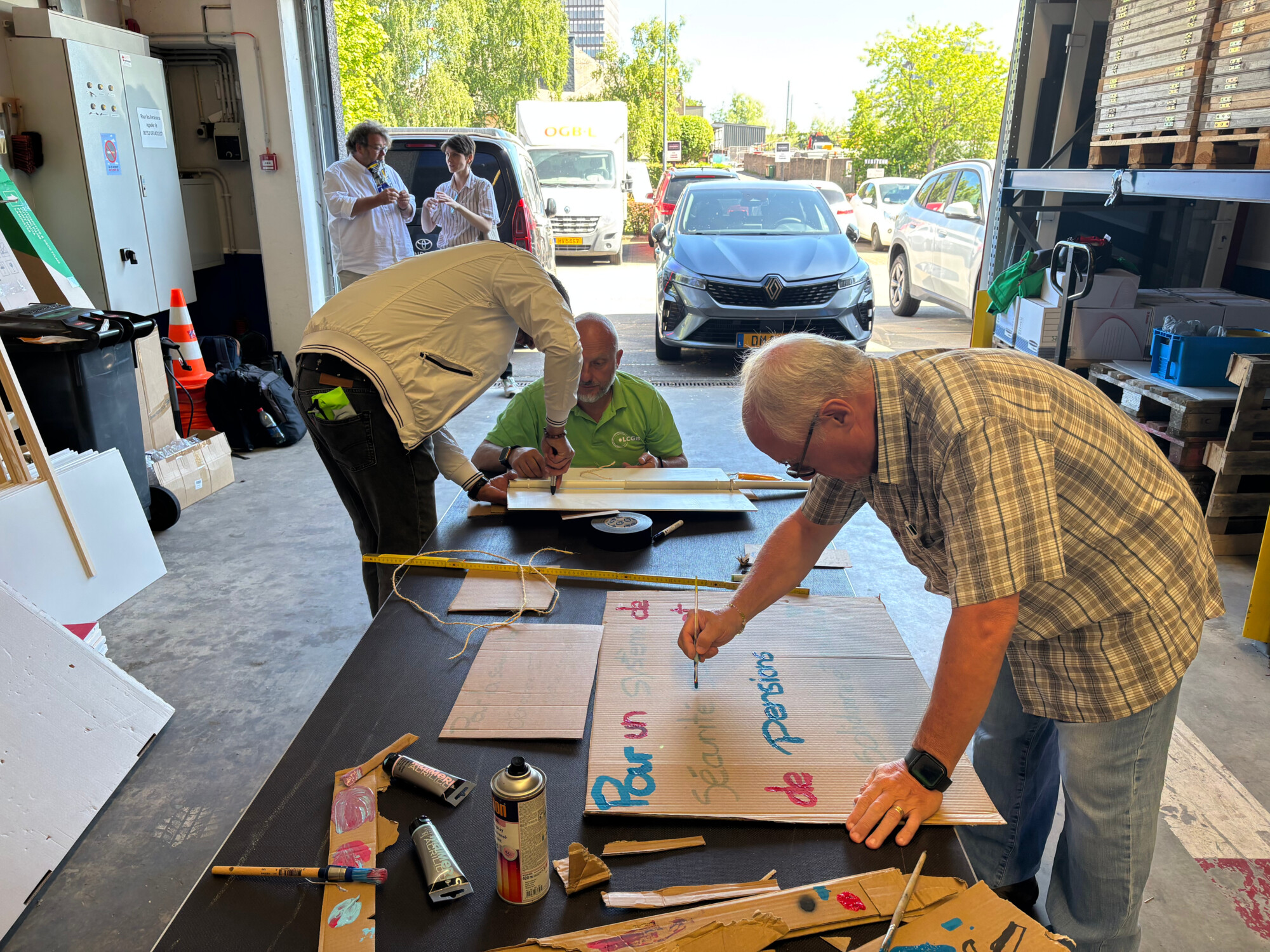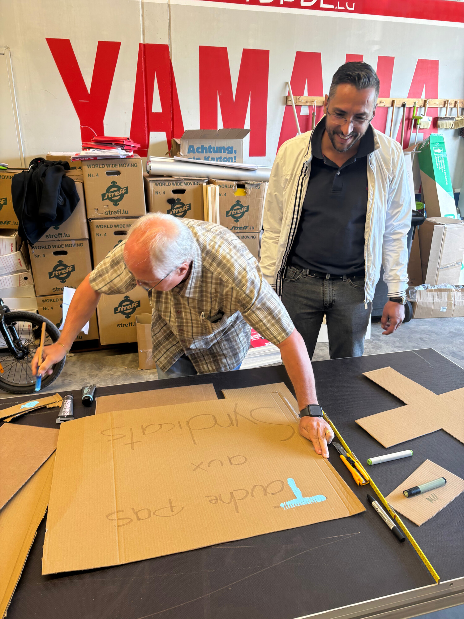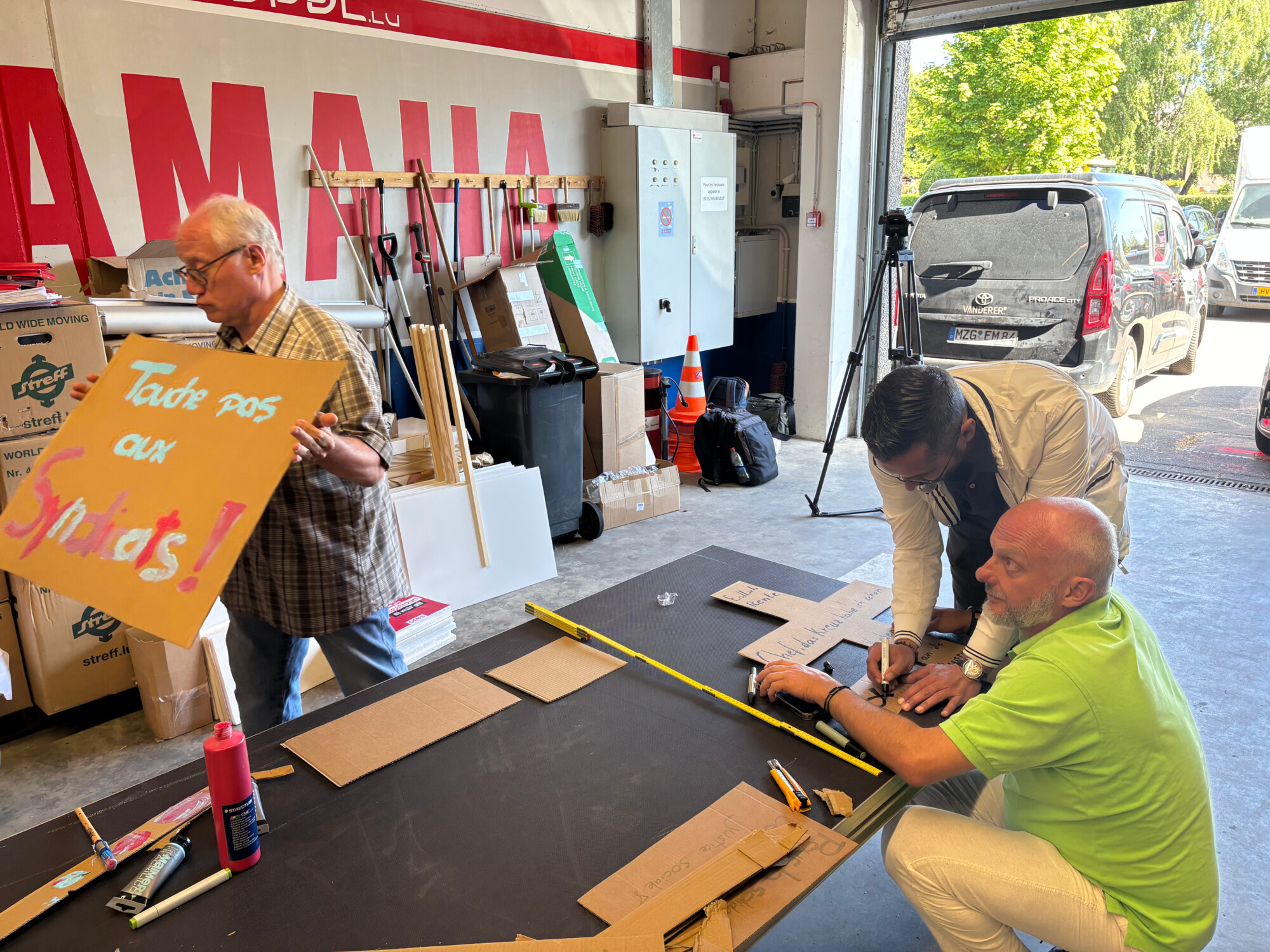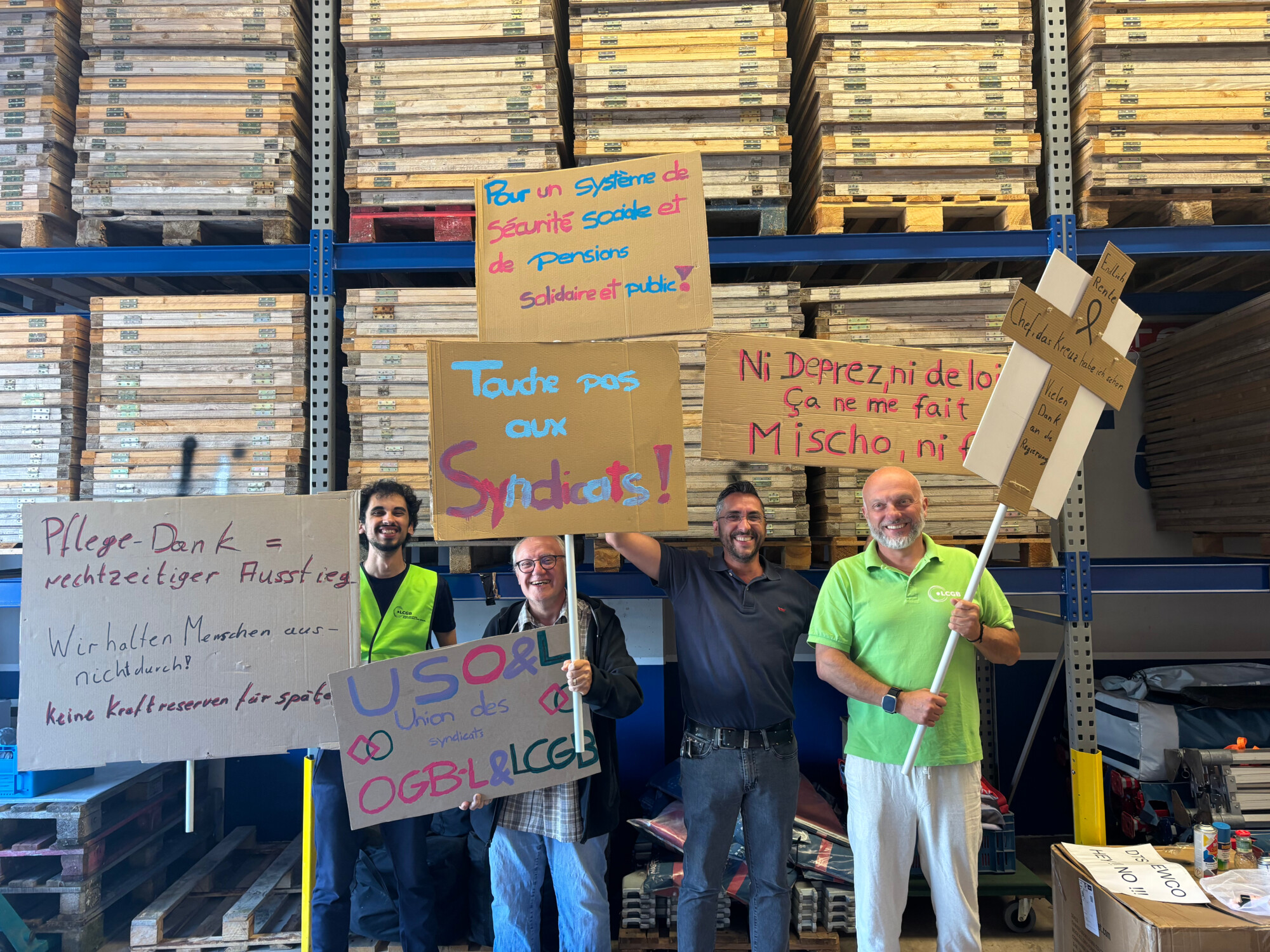 Die Mitglieder des LCGB und des OGBL aus dem Gesundheitssektor haben sich in einer gemütlichen Atmosphäre getroffen, um die Plakate für die große Demonstration am 28. Juni vorzubereiten.
