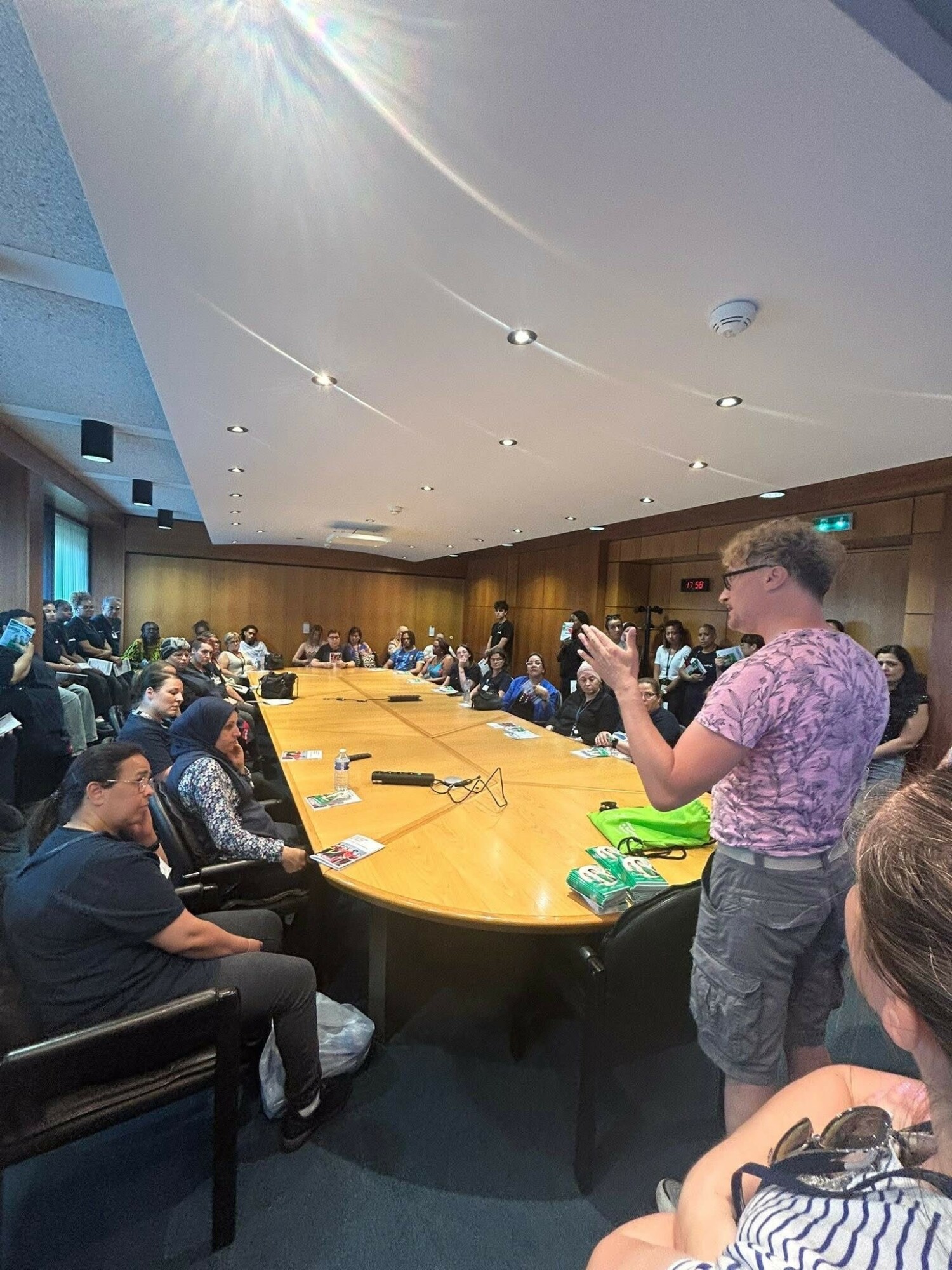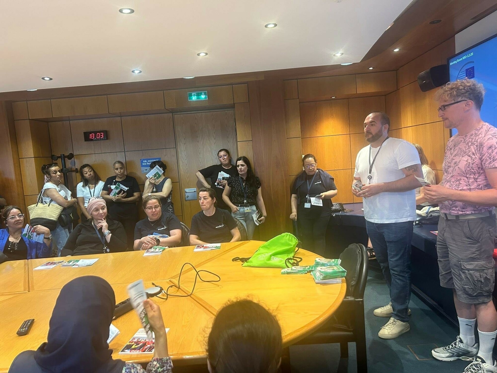 Der LCGB hat sich mit den Beschäftigten von Sodexo in Luxemburg-Kirchberg in der Europäischen Investitionsbank getroffen, um sie für die große nationale Demonstration am 28. Juni zu mobilisieren. Die Beschäftigten haben ihre Solidarität im Kampf gegen die Verschlechterung des Rentensystems und der Kollektivverträge ausgedrückt.
