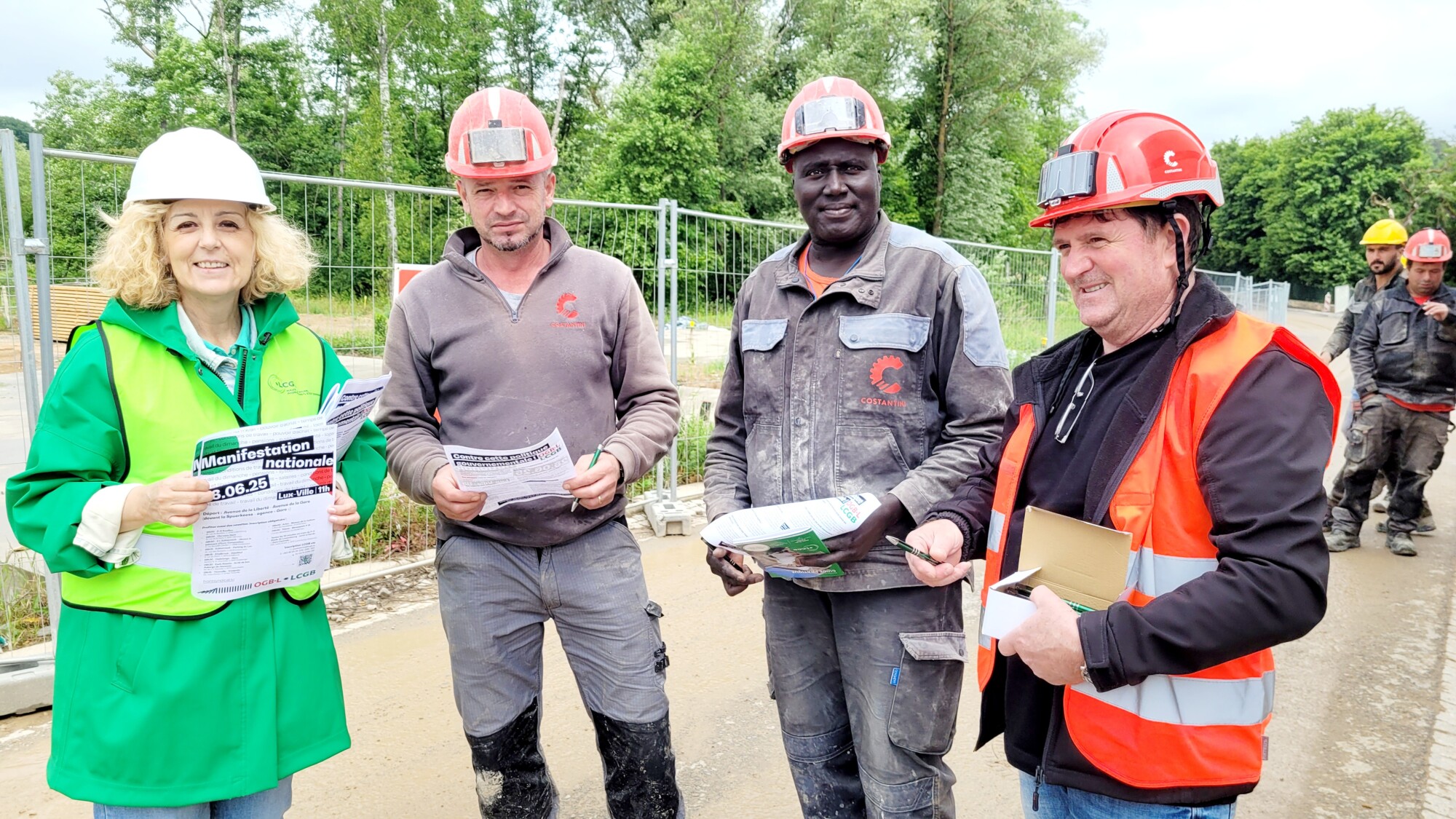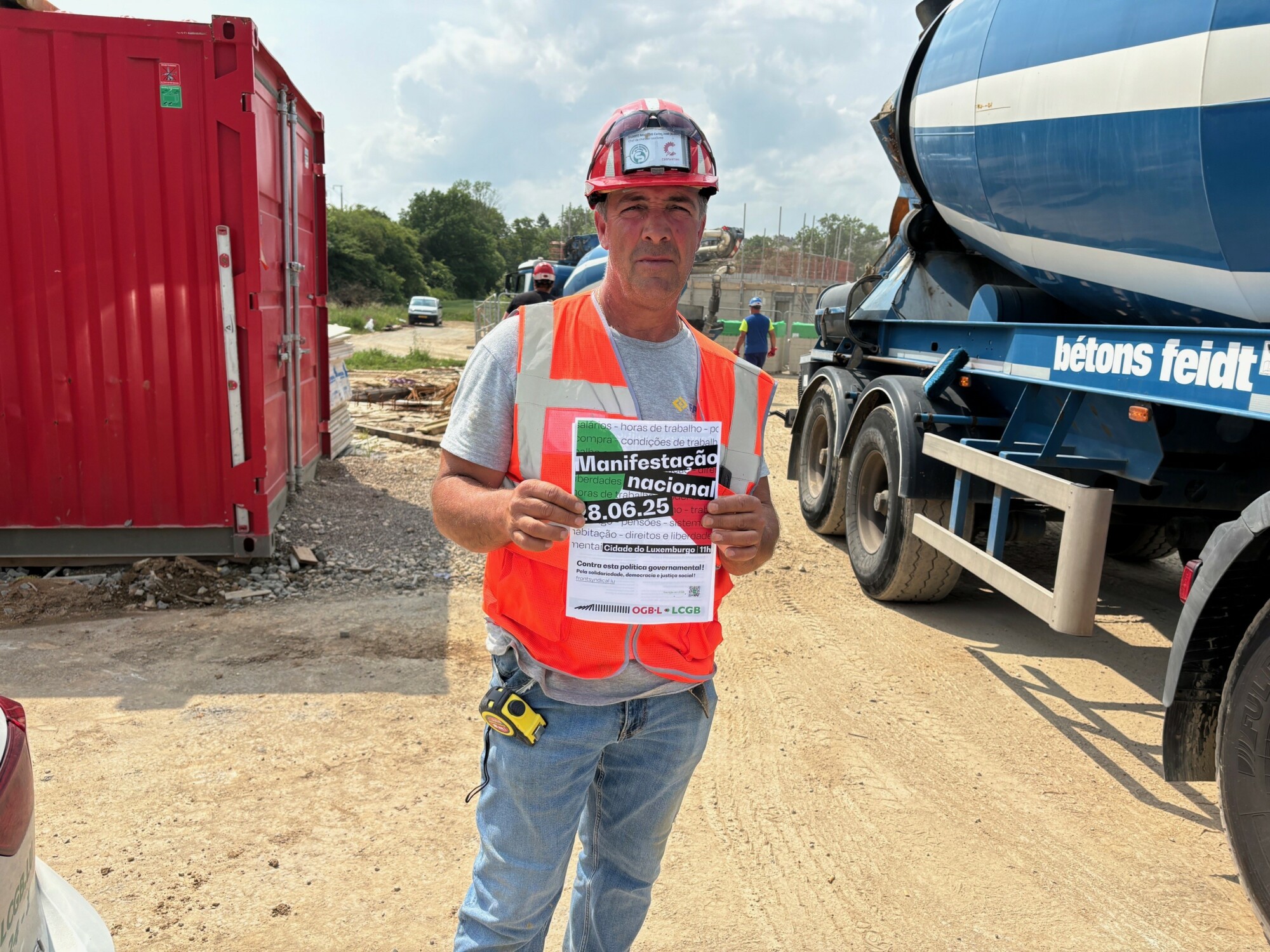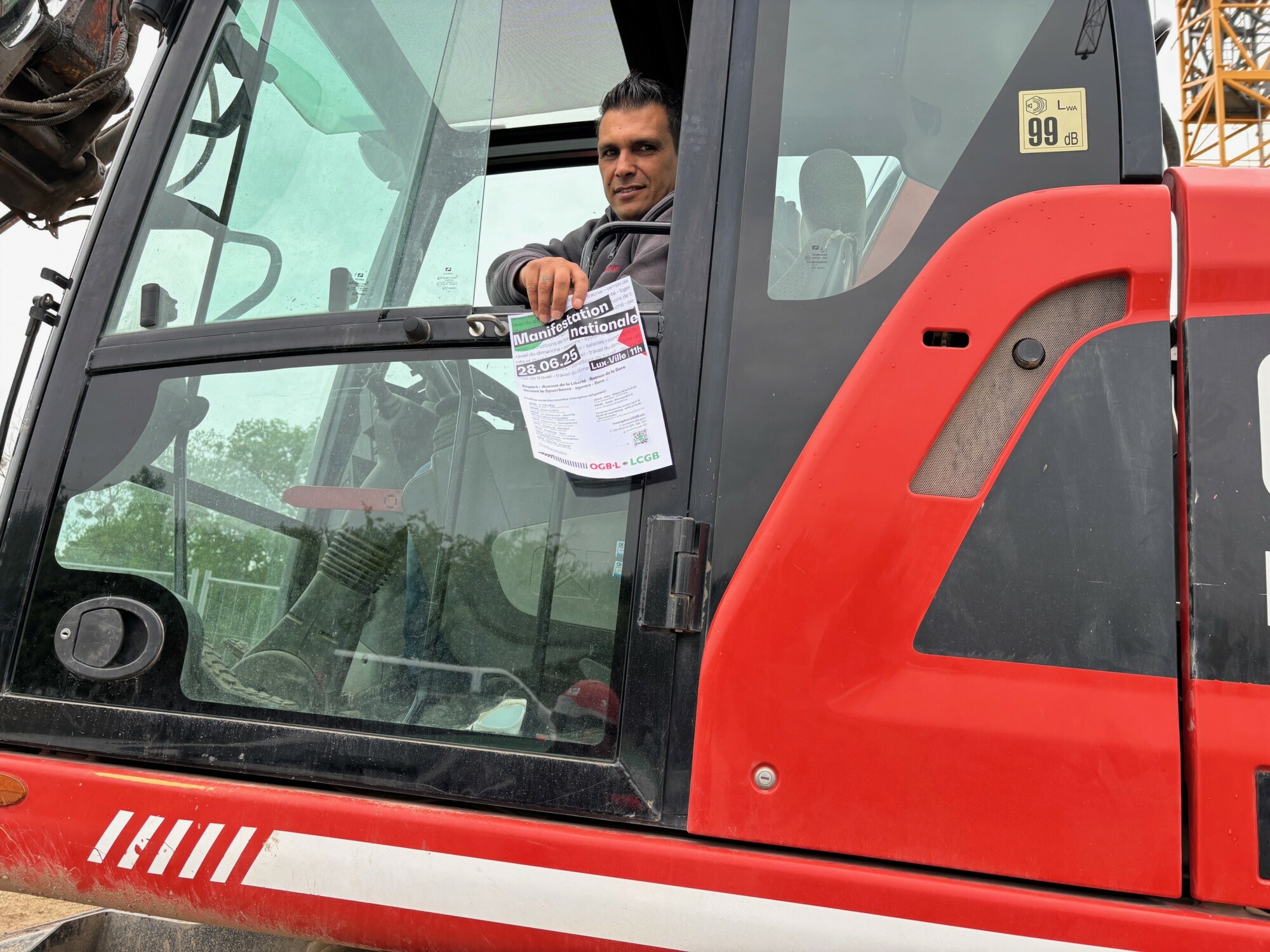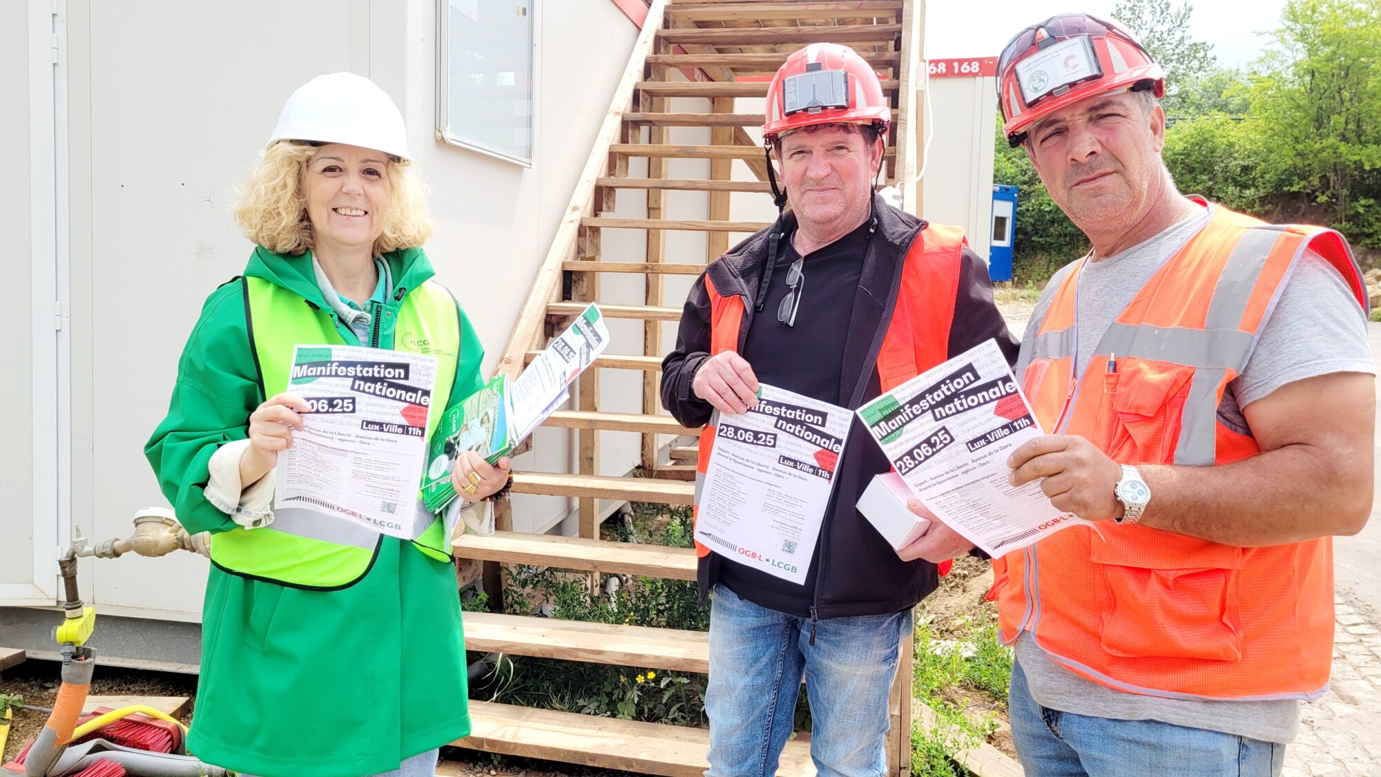 Lors d’une action de distribution, les salariés des entreprises de construction Karp-Kneip, Costantini, Skyliners et Félix Giorgetti ont été mobilisés pour la grande manifestation nationale qui se tiendra le 28 juin à Luxembourg-Ville. Les employés ont manifesté leur solidarité dans la lutte pour notre modèle social basé sur la négociation collective et la culture du compromis dans l’intérêt du pays, pour nos salaires et nos conditions de travail, pour un système de sécurité sociale et de pensions solidaire et public.
