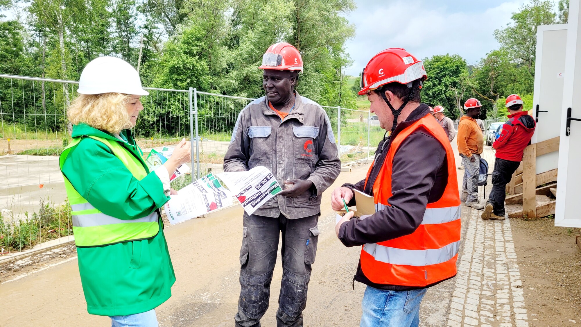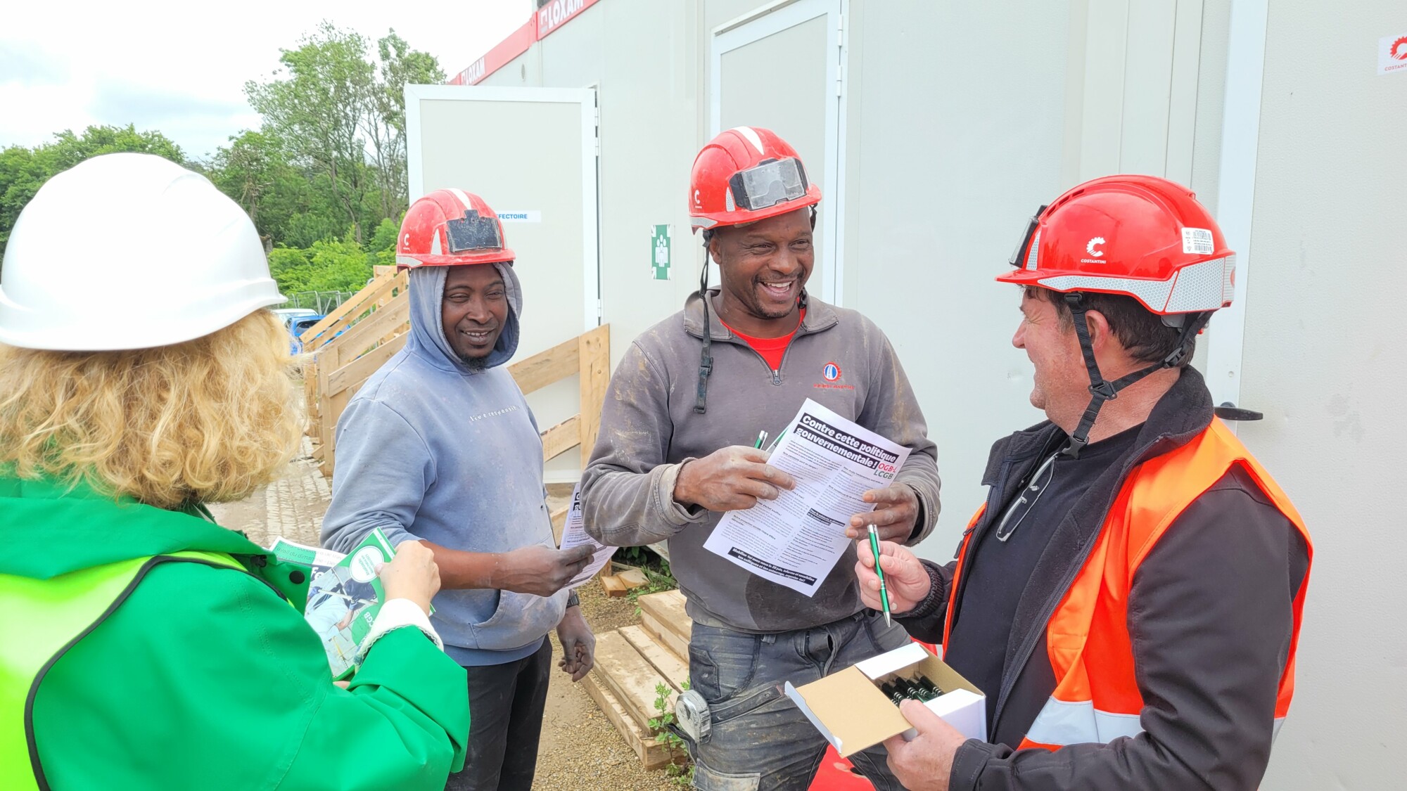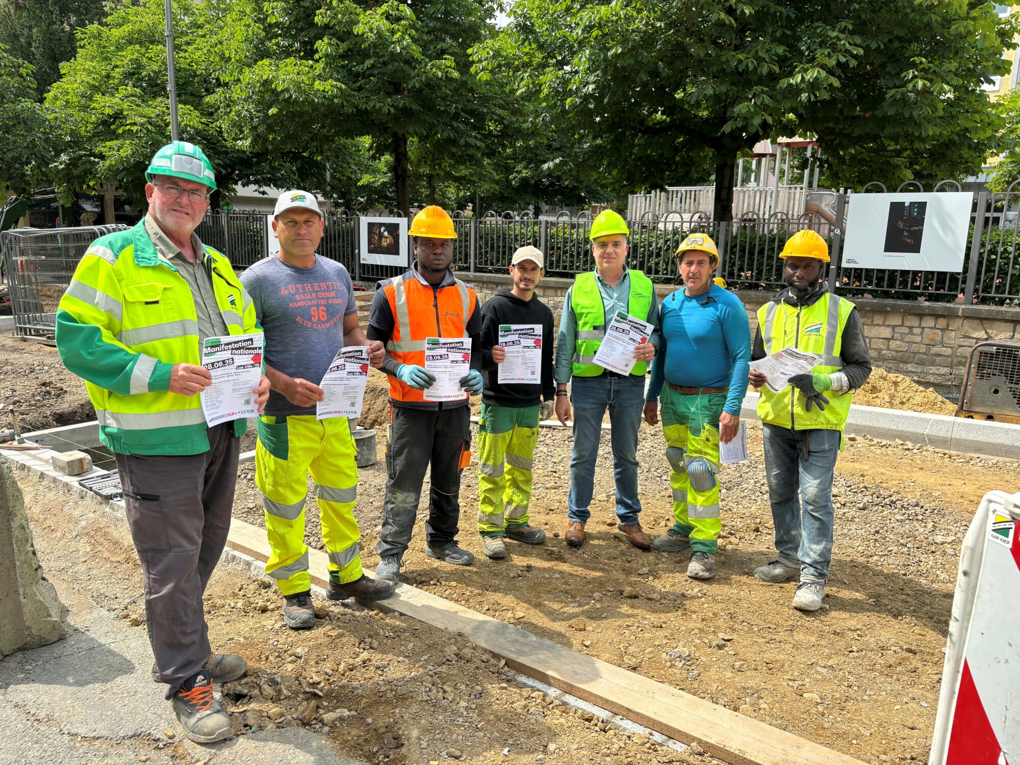 Lors d’une action de distribution, les salariés des entreprises de construction Karp-Kneip, Costantini, Skyliners et Félix Giorgetti ont été mobilisés pour la grande manifestation nationale qui se tiendra le 28 juin à Luxembourg-Ville. Les employés ont manifesté leur solidarité dans la lutte pour notre modèle social basé sur la négociation collective et la culture du compromis dans l’intérêt du pays, pour nos salaires et nos conditions de travail, pour un système de sécurité sociale et de pensions solidaire et public.