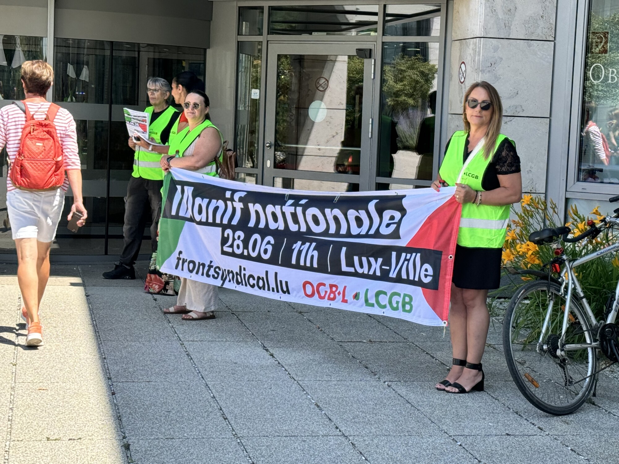 Le 20 juin 2025, les délégués motivés du LCGB-Nettoyage de bâtiments se sont réunis devant les Hôpitaux Robert Schuman afin de mobiliser le public pour la manifestation nationale du 28 juin.